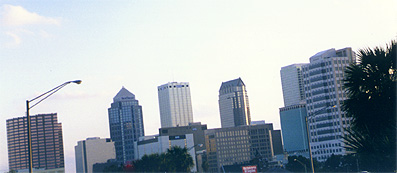 Downtown Tampa (taken from the car window)I then cut across central Florida. The arguably shortest route would have been to drive through Orlando, but since one of the goals of my trip was to see the Southeast and I knew I would be in Orlando in another day or so, I took a slightly more northern route, toward Gainesville. Missing Gainesville, I then traveled down the west side of the state, through Ocala, and into Tampa just at rush hour (and just a little before sunset). Traffic was a little bit slow, but not too bad. (Kind of reminded me of home.)